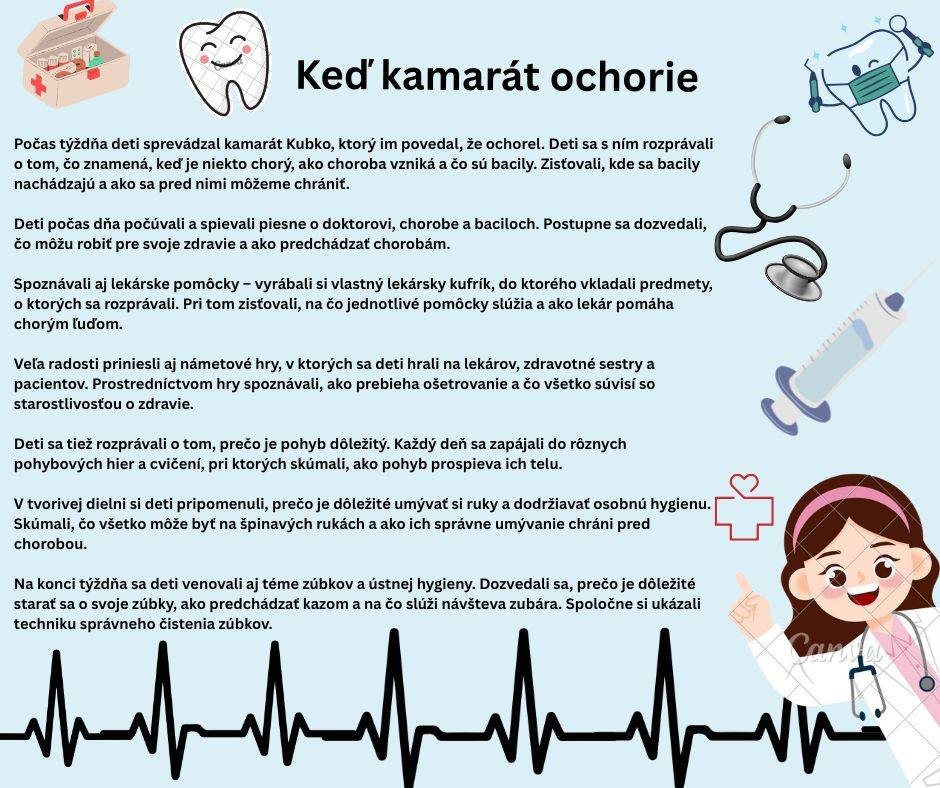 Deti počas dňa počúvali a spievali piesne o doktorovi, chorobe a baciloch. Postupne sa dozvedali, čo môžu robiť pre svoje zdravie a ako predchádzať chorobám. Spoznávali aj lekárske pomôcky – vyrábali si vlastný lekársky kufrík, do ktorého vkladali predmety, o ktorých sa rozprávali. Pri tom zisťovali, na čo jednotlivé pomôcky slúžia a ako lekár pomáha chorým ľuďom. Veľa radosti priniesli aj námetové hry, v ktorých sa deti hrali na lekárov, zdravotné sestry a pacientov. Prostredníctvom hry spoznávali, ako prebieha ošetrovanie a čo všetko súvisí so starostlivosťou o zdravie.
